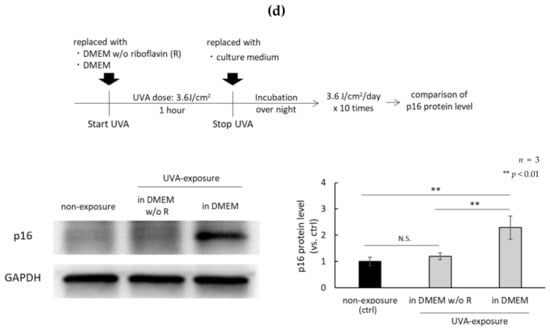 - Yoshimoto, S.; Yoshida, M.; Ando, H.; Ichihashi, M. Establishment of photoaging in vitro by repetitive UVA irradiation: Induction of characteristic markers of senescence and its prevention by PAPLAL with potent catalase activity. Photochem. Photobiol. 2018, 94, 438–444. [Google Scholar] [CrossRef]