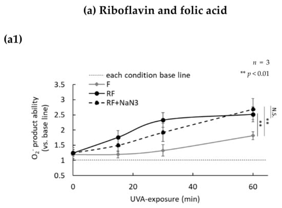 The superoxide assay was carried out using a superoxide anion-2-methyl-6-methoxyphenylethynylimidazopyrazynone (MPEC) reaction kit (ATTO, Tokyo, Japan). Light emission was measured using a microplate reader. One hundred µL of each sample exposed to UVA were transferred to 96-well plates and 10 µL MPEC (300 µM stock reagent) were added, which was followed by UVA irradiation for 2 min. After UVA irradiation, the luminescence of MPEC was measured for 1 min. Readings measured at 0, 15, 30, and 60 min from the start of UVA irradiation were compared as the superoxide production ability.