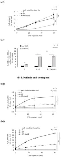 - Sato, K.; Taguchi, H.; Maeda, T.; Minami, H.; Asada, Y.; Watanabe, Y.; Yoshikawa, K. The primary cytotoxicity in ultraviolet-a-irradiated riboflavin solution is derived from hydrogen peroxide. J. Investig. Dermatol. 1995, 105, 608–612. [Google Scholar] [CrossRef]