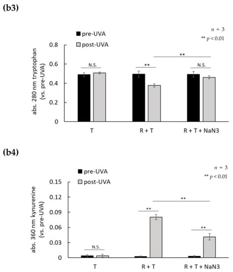 Tryptophan and kynurenine were measured using a variable wavelength detector at wavelengths of 280 nm and 360 nm, respectively, according to a previously published protocol [31]. Media containing tryptophan, tryptophan + riboflavin or tryptophan + riboflavin + NaN3, were UVA irradiated and the concentrations of those chemicals were measured before and after the UVA exposure. Absorption wavelengths were measured using a GeneQuant 1300/10 (GE Healthcare Life Science Japan, Tokyo, Japan) in a spectrofluorometric quartz cell having an optical path length of 10 mm.