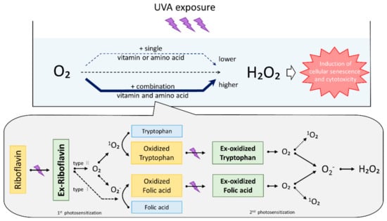 The function of H2O2 production derived from photosensitized reactions with folic acid or tryptophan using riboflavin as an initiator. Amino acids and vitamins were oxidized by type I or type Ⅱ photosensitization by excited riboflavin during UVA exposure. Lastly, oxidized-tryptophan and oxidized-folic acid act to absorb UVA radiation as secondary UVA photosensitizers and promote the production of singlet oxygen and superoxide, which leads to high levels of H2O2 formation.