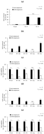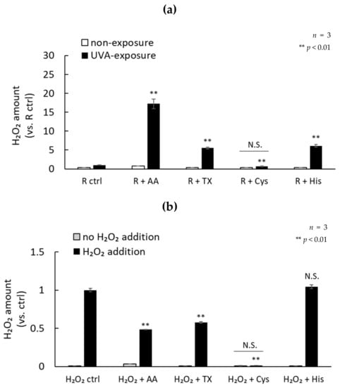 Lastly, we measured the photosensitization of each antioxidant and riboflavin, and the H2O2 scavenging ability. Each antioxidant other than cysteine in the presence of riboflavin enhanced H2O2 production by UVA irradiation. In particular, ascorbic acid showed a remarkably enhanced production of H2O2. The addition of cysteine to riboflavin reduced the production of H2O2 after UVA exposure to a similar level as non-exposure (Figure 7a). L-cysteine effectively scavenged 100 µM H2O2. In addition, ascorbic acid and trolox also showed high H2O2 scavenging ability, but L-histidine did not scavenge H2O2 (Figure 7b). These data suggest that photosensitized antioxidants may contribute to the induction of oxidative damage by UVA exposure in the presence of riboflavin. Furthermore, our data suggest that chemicals with a high H2O2 scavenging ability, such as L-cysteine, may be highly effective in reducing the cytotoxicity caused by UVA.