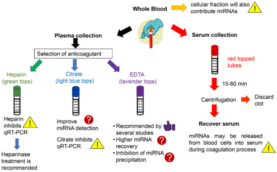 The sample source is one of the most critical aspects of c-miRNA levels determination [78]. The expression of miRNAs is different between the samples extracted from the serum and plasma even from the same individual. In addition, whole blood should be avoided because cellular fraction will also contribute miRNAs (Figure 1) [79].