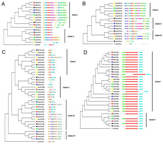 To further understand the phylogenetic relationships of RcATGs, we conducted phylogenetic analyses in the multi-member subfamilies ATG1, ATG13, ATG18 and ATG8, using the amino acid sequences of RcATGs and their orthologs from Arabidopsis [23,24,25,26], rice [17], tobacco [18], maize [19] and yeast (S. cerevisiae) [3]. As shown in Figure 2, in the ATG1 subfamily, ATG1s were divided into two clades according to their evolutionary relationship (Figure 2A). The motif distribution in clade I is very similar compared to clade II. In the ATG13 subfamily, ATG13s were divided into three clades according to their sequence similarity (Figure 2B). Interestingly, RcATG13c was placed outside the clades because it did not contain many of the diagnostic motifs. In the ATG18 subfamily, ATG18s were clustered into four clades. Proteins in clade III and clade IV have more motifs compared with the other two clades (Figure 2C). In the ATG8 subfamily, the generated phylogenetic tree formed two distinct clades with well-supported bootstrap values (Figure 2D). It was clearly observed that almost all ATG8s were similar in length and had identical numbers of motifs, indicating that ATG8s were quite conserved across different species. However, 4 out of 6 ATG8s in clade II (66.7%) lack one or two motifs, whereas only ZmATG8e (4%) in clade I is absent.
