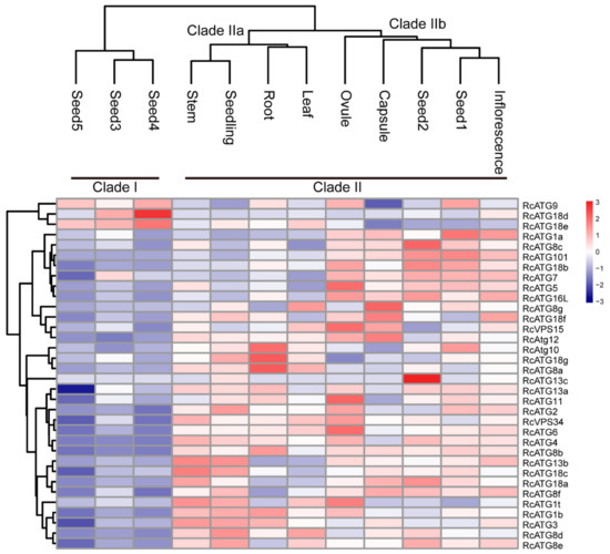Although the occurrence of the autophagy process requires the participation of multiple members within an activated autophagy network, a number of studies have shown that the expressional profiles of many ATG genes varied among different tissues [19], implying that different ATG genes might be involved in different biological processes. To understand the potential functions of RcATGs, we investigated the expression profiles of RcATGs in different tissues, including root, stem, leaf, seedling, ovule, capsule, inflorescence and seed across different development stages (seed1–seed5). The FPKM values of different tissues were acquired from the castor bean genome database (https://woodyoilplants.iflora.cn/). As shown in Figure 3, most RcATGs were differentially expressed among tissues. For instance, RcATG10, RcATG18g and RcATG8a were more highly expressed in root relative to other tissues; RcATG1a, RcATG8c, RcATG101, RcATG18b, RcATG7, RcATG5 and RcATG16L were more highly expressed in reproductive tissues (ovule, capsule and inflorescence) and early seed (seed1 and seed2); RcATG18d and RcATG13c were more highly expressed in seed4 and seed2, respectively. During seed development, fewer genes were preferentially expressed in late seeds (seed3–seed5), especially fully mature seeds (seed5), while many ATGs were highly expressed in early seeds (seed1 and seed2). Depending on the gene expression pattern, hierarchical cluster analysis was performed to further explore similarities among samples. Twelve samples clustered into two major clades, designated as clade I and clade II. Clade II bifurcated into two subclades; clade IIa corresponded to vegetative tissues including root, leaf and stem; and clade IIb corresponded to early seed tissues (seed1 and seed2) and reproductive tissues, such as ovule, capsule and inflorescence. Clade I included all mature seed tissues, including seed3, seed4 and seed5. These results suggested that autophagy may not only vary greatly among different tissues but also participate in different biological processes at different seed development stages in castor beans.