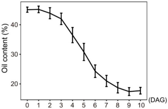 Figure 5. Oil content of germinating endosperm. DAG: days after germination. Bars = means ± SD from three biological replicates.