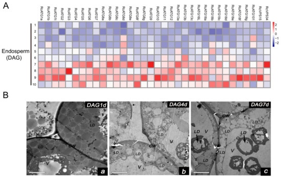 Figure 6. (A) Expression profiles of RcATGs in germinating endosperm. The expression profile was constructed depending on the relative expression level of RcATGs at different germination stages (DAG: days after germination). The expression is normalized to RcACTIN2 and the data are means ± S.D. from three biological replicates. Blue boxes indicate the lower transcriptional level of RcATGs and red boxes indicate the higher expression level of RcATGs. The scale bar represents relative expression level after normalization. (B) Transmission electron microscopy of germinating endosperm (LD: lipid droplets; V: vacuole; CW: cell wall). a: DAG1d, b: DAG4d, c: DAG7d.