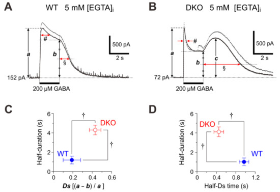 Figure 1. GABAAR-mediated currents evoked by GABA puff applications in wild-type and PRIP-DKO pyramidal cells. (A and B) Sample traces of GABAAR-mediated currents evoked at 0 mV in wild-type and PRIP-DKO pyramidal cells dialyzed with 5 mM EGTA, respectively, by puff application (4 and 6 psi) of GABA for 2 s. a, b, and c are the peak amplitude, the amplitude at the offset of the puff application, and the peak amplitude after the offset of the puff application, respectively. # and § are the durations at half amplitudes of desensitized component ([(a + b)/2]) and of tail-currents, respectively. (C) The relationship between the desensitization degree [Ds = (a – b)/a] of the GABAAR-mediated currents and half-duration of the tail-current (§) induced by a puff with 4 psi. †: p <0.01. (D) The relationship between the half-desensitization time of the GABAAR-mediated currents (#) and half-duration of the tail-current (§) induced by a puff with 4 psi. †: p <0.01. Adopted from [15].