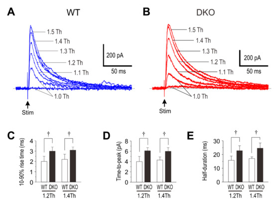 Figure 2. Evoked IPSCs (eIPSCs) in wild-type and PRIP-DKO pyramidal cells. (A and B) Superimposed sample traces of IPSCs evoked by stimulation with 1.0–1.5 times threshold (1.0–1.5 Th) in wild-type (A) and PRIP-DKO pyramidal cells (B). (C) The mean 10%–90% rise times of IPSCs evoked by stimulation with 1.2 Th in wild-type (n = 8) and PRIP-DKO pyramidal cells (n = 7) and those evoked by stimulation with 1.4 Th in wild-type (n = 8) and PRIP-DKO pyramidal cells (n = 7). †: p <0.01. (D) The mean times-to-peak of IPSCs evoked by stimulation with 1.2 Th in wild-type (n = 8) and PRIP-DKO pyramidal cells (n = 7) and those evoked by stimulation with 1.4 Th in wild-type (n = 8) and PRIP-DKO pyramidal cells (n = 7). †: p <0.01. (E) The mean half-durations of IPSCs evoked by stimulation with 1.2 Th in wild-type (n = 8) and PRIP-DKO pyramidal cells (n = 7) and those evoked by stimulation with 1.4 Th in wild-type (n = 8) and PRIP-DKO pyramidal cells (n = 7). †: p <0.01. Adopted from [35].