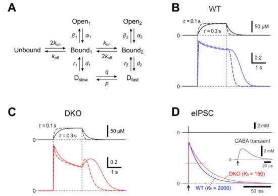 Figure 3. A kinetic model for a hump-like tail-current. (A) A kinetic model of GABAARs representing mono- and double-liganded states, each providing access to open and desensitized states. (B and C) Top; Presumed [GABA] changes created by puff application of GABA with a rectangular pressure pulse through a puff pipette containing 200 μM GABA in the extracellular medium was assumed to be diluted 4 times and the onset and offset of the puff application were assumed to be attenuated with a time constant ranging between 0.1 and 0.3 s. Bottom; superimposed traces of the simulated GABAAR-mediated currents under the condition that the attenuation time constant is 0.3 and 0.1 s (solid and interrupted traces, respectively) in simulated wild-type (B) and PRIP-DKO (C) pyramidal cells. The rate constants were as follows (in s−1): kon = 15 μM−1, β2 = 2500, α2 = 142, r2 = 50, β1 = 200, α1 = 1100, r1 = 0.35, d1 = 6, q = 1 × 10−8 μM−1, and p = 1. The values of koff in WT and PRIP-DKO GABAARs were 90 and 30 s−1, respectively. The value of dmax in WT and PRIP-DKO GABAARs was 3600. The values of kh in WT and PRIP-DKO GABAARs were 2000 and 200, respectively. (D) Superimposed traces of a simulated wild-type and PRIP-DKO eIPSC induced by a GABA transient shown on an expanded time scale (inset) with a small maximum conductance. The rate constants were as follows (in s−1): kon = 20 μM−1, β2 = 2500, α2 = 195, r2 = 55, β1 = 100, α1 = 600, r1 = 0.35, d1 = 11, q = 1 × 10−8 μM−1, p = 0, and dmax = 3100. The values of koff in WT and PRIP-DKO GABAARs were 550 and 410 s−1, respectively. The value of dmax in WT and PRIP-DKO GABAARs was 310. The values of kh in WT and PRIP-DKO GABAARs were 2000 and 150, respectively. Adopted from [15] and [35].
