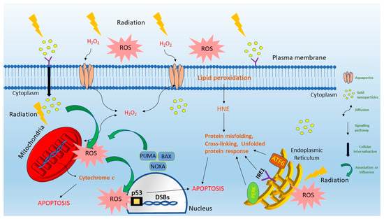 The generally accepted target in radiation therapy is double strand cleavage of cellular DNA by direct or indirect mechanisms [19]. The cell nucleus then intuitively becomes of primary interest to target for targeting nanoparticles [20,21]. Liu et al. utilized gold nanoparticles functionalized with nitroimidazole and a cell penetrating peptide to localise uptake and damage to the cell nucleus and increase oxidants within the cell environment. This resulted in a dose enhancement with a clinically-relevant X-ray source [4]. Typically however, most nanoparticles do not penetrate the nucleus [3,22,23] and there are conflicting reports of DNA damage being associated with nanoparticle radiosensitization. Depending on experimental variables, nanoparticles may [24], or may not [25], increase DSBs. Most ROS are typically short lived and interact within a limited, local environment [26]. This suggests there may be other intracellular targets that induce oxidative stress and cause cell apoptosis; likely targets being endosomes, lysosomes and the mitochondria [27]. This section identifies how ROS can lead to cell death with interest in understanding how, if ROS generation is enhanced, cell death can be achieved with or without ROS causing nuclear DNA damage.