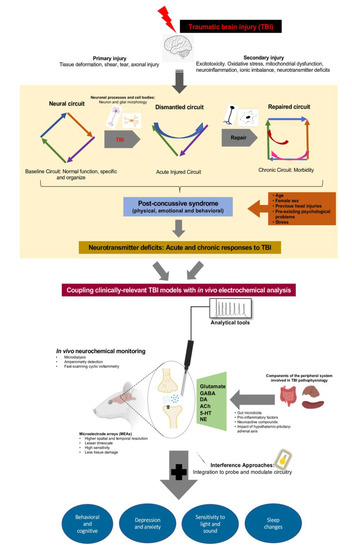 In this review, we have discussed the clinical and experimental evidence on the acute and chronic pathophysiological responses after mild TBI, animal models of diffuse brain injury, alterations of neurotransmitter systems that underlie the circuit deficits which can compromise and/or compensate the processes that enables neuronal response to injury. Alterations in the TBI-induced neurotransmitter systems that form the core machinery expressed by most of the neurons have been considered crucial in the development of PCSs. Multiple in vivo electrochemical measurements with increasing resolution offers a portal to directly quantify and characterize the dynamic real-time neurotransmitter signaling mechanisms that operate during behavior to provide important details of the pathophysiology of circuit function. Advances in the application of interference tools permit more direct modulation of in vivo control of neurotransmitter signaling in animals engaged in freely moving and defined behaviors (see Figure 1 for details). Given the unmet clinical need to modulate neurochemical signaling in the diseased state, including TBI, the future of electrochemical characterization can be fully adapted to apply behavioral shaping pharmacological interventions that normalize neurotransmitter signaling.
