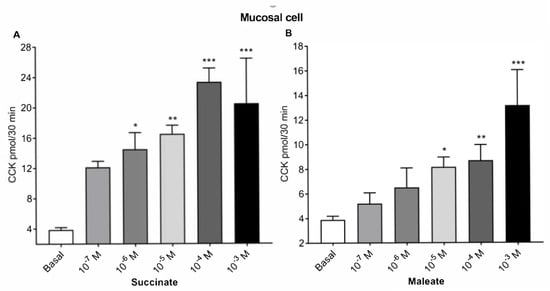 Dose responses of succinate and maleate in duodenal mucosal cells. Cholecystokinin (CCK) release from duodenal mucosal cells by succinate (A) and maleate (B). Succinate and maleate doses dependently stimulated CCK release from duodenal mucosal cells. CCK was measured in a bioassay and is expressed as a CCK release/30 min collection period. Results were expressed as mean ± SEM, n = 6. * p < 0.05, ** p < 0.01, *** p < 0.001, compared with basal values.