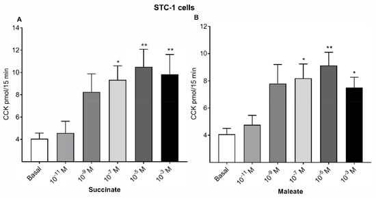 We further studied succinate (Figure 2A) and maleate-stimulated (Figure 2B) CCK secretions using the enteroendocrine cell line STC-1. Basal CCK release from STC-1 cells was 4.1 pmol/15 min. Succinate (10−5 M) caused a maximum CCK release of 10.5 pmol and a half-maximal response at 10−7 M succinate. Maleate (10−5 M) caused a maximum CCK release of 9.1 pmol, with a half-maximal response at 10−7 M maleate from STC-1 cells.