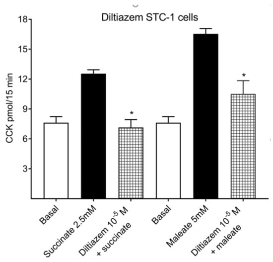 To confirm the amylase release from pancreatic acini, a specific CCK1 receptor-antagonist l-364718 (1µg/mL) [54] was added to the CCK bioassay, in combination with the eluates from mucosa cells or supernatants from STC-1 cells. The changes in intracellular calcium ion concentrations are receptor-regulated signals and precede secretions. To study the possible involvement of calcium channels in maleate and succinate-stimulated CCK release, we used diltiazem, which blocks l-type calcium channels [23]. STC-1 cells were incubated for 15 min with 10−5 M diltiazem before stimulation with succinate or maleate, and CCK was measured.