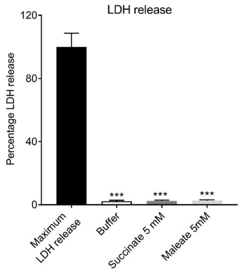 To confirm physiological effects of maleate and succinate, cytotoxic effects of maleate and succinate were studied by measuring lactate dehydrogenase (LDH) release from STC-1 cells [3]. LDH is a cytosolic enzyme release into the culture medium upon cell death due to plasma membrane damage. Cells were cultured; 1 × 105 cells/well were plated into six-well plates and used when subconfluent. Cells were washed twice with HEPES buffer and preincubated for 15 min with 1 mL of buffer at 37 °C, 5% CO2. The cells were treated with maleate or succinate and incubated for 15 min. After stimulation period, the cells were lysed with lysis buffer to obtain the maximum LDH activity and incubated for 45 min. Supernatants were collected for LDH measurements by a LDH cytotoxicity assay kit (Thermo Fisher Scientific, Waltham, MA, USA) as per user instructions, and the LDH release percentage was calculated according to the manufacturer’s instructions.