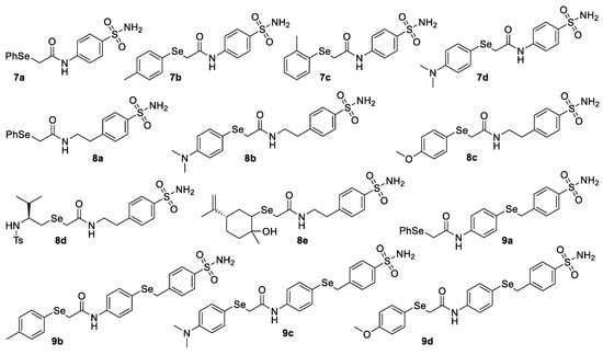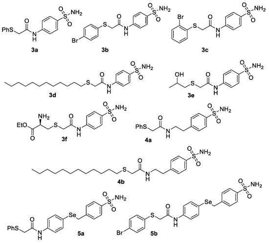 - Tanini, D.; Capperucci, A.; Scopelliti, M.; Milaneschi, A.; Angeli, A.; Supuran, C.T. Syntesis of thio- and seleno-acetamides bearing benzenesulfonamide as potent inhibitors of human carbonic anhydrase II and XII. Bioorg. Chem. 2019, 89, 102984. [Google Scholar] [CrossRef]