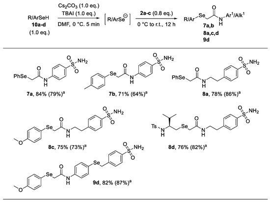 - Angeli, A.; Tanini, D.; Capperucci, A.; Supuran, C.T. Synthesis of Novel Selenides Bearing Benzenesulfonamide Moieties as Carbonic Anhydrase I, II, IV, VII, and IX inhibitors. ACS Med. Chem. Lett. 2017, 8, 1213–1217. [Google Scholar] [CrossRef]