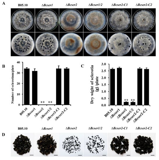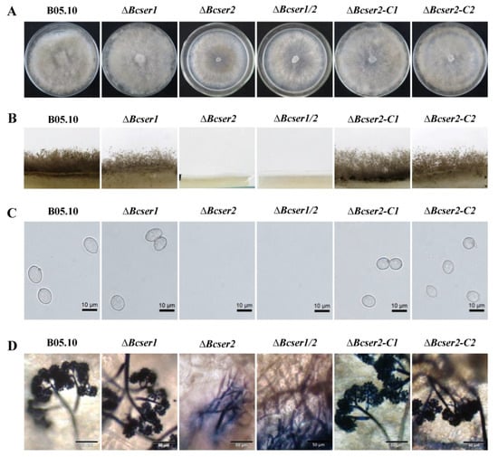 qRT-PCR analysis was used to determine the expression patterns of Bcser1 and Bcser2 in B. cinerea during growth and infection. Results indicated that when B05.10 strain was inoculated on PDA, the transcript levels of both Bcser1 and Bcser2 were significantly up-regulated at 132 hpi and 156 hpi, the peak of Bcser1 gene expression was at 156 hpi, while Bcser2 was at 136 hpi (Figure 1B). When B05.10 strain was inoculated on leaves of A. thaliana, the transcript levels of Bcser1 and Bcser2 were significantly up-regulated at 72 hpi and 96 hpi, and the transcript levels of both genes were highest at 96 hpi (Figure 1C). Furthermore, the semi-quantitative RT-PCR results are consistent with these results (Figure S3). The results suggested that Bcser1 and Bcser2 may play important roles during sclerotial formation and pathogenesis of B. cinerea. To explore the function of Bcser1 and Bcser2 in B. cinerea, gene deletion mutants were generated using a homologous recombination strategy (Figure S1A). A total of 4, 6, and 6 transformants of Bcser1, Bcser2, and a double gene deletion were generated and checked by PCR and Southern blot analysis (Figure S1C) to confirm that the targeted gene was replaced by a single copy marker gene. After that, several rounds of single-spore isolation were carried out until the target gene was completely removed from the mutant strains [30]. Isolated mutants were checked via PCR analysis (Figure S1D–F). After that, biological phenotypes such as the sclerotial formation and conidiation of WT, Bcser1 deletion mutant ∆Bcser1, Bcser2 deletion mutant ∆Bcser2, and double deletion mutant ∆Bcser1/2 were compared. The results showed that the deletion of Bcser1 had no obvious effect on conidiation and sclerotial formation of B. cinerea (Figure 2 and Figure 3). Interestingly, ∆Bcser2 and ∆Bcser1/2 mutants failed to produce any sclerotia on PDA medium in darkness at 20 °C for 2 weeks, while the WT strain formed many black sclerotia (Figure 2A,B). At the same time, the mutant ∆Bcser2 and ∆Bcser1/2 showed a slightly slower growth rate on PDA medium compared with the WT strain (Figure S4C). When cultured on sterilized carrot fragments for two months, ∆Bcser2 and ∆Bcser1/2 strains formed relatively fewer and much smaller sclerotia (Figure 2C,D, and Figure S5). Furthermore, the mutants ∆Bcser2 and ∆Bcser1/2 lost the ability to produce conidia on PDA medium (Figure 3A–C). Our results showed that the colony surface of ∆Bcser2 and ∆Bcser1/2 are very smooth, however, the colony surface of wild-type and complementary strain are full of aerial hypha (Figure 3A). Moreover, there were no conidiophores were formed in ∆Bcser2 and ∆Bcser1/2 mutants, while a large number of conidiophores were formed in the wild-type and complementary strain (Figure 3B). When ∆Bcser2 and ∆Bcser1/2 mutants were inoculated into Arabidopsis leaves, they again could not produce any conidiophores and conidia (Figure 3D). These results indicated that Bcser2 may be involved in sclerotial formation and conidiation in B. cinerea. To confirm the important roles of Bcser2 in sclerotial formation and conidiation in B. cinerea, gene in situ complementation mutants were generated using a homologous recombination strategy in mutant ∆Bcser2. Single spore isolated complementary strains ∆Bcser2-C1 and ∆Bcser2-C2 were checked via PCR and RT-PCR analysis (Figure S2). Our results showed that the Bcser2 complementary strains ∆Bcser2-C1 and ∆Bcser2-C2 restored sclerotial formation and conidiation to the level of WT strain B05.10. These results demonstrated that Bcser2 plays an important role in sclerotial formation and conidiation in B. cinerea, and Bcser1 seems to not be essential in these processes.