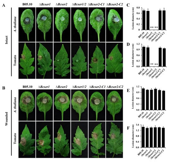 Virulence assays of mutants and wild-type strains on detached Arabidopsis and tomato leaves. (A) Intact leaves of Arabidopsis and tomato were inoculated with mycelial agar plugs (diameter = 3 mm) from the margins of actively growing colonies of deletion mutants ∆Bcser1, ∆Bcser2, and ∆Bcser1/2, complemented mutants ∆Bcser2-C1 and ∆Bcser2-C2, and wild-type strain B05.10 on PDA plates. Photographs were captured at 72 hpi. (B) Wounded leaves of Arabidopsis and tomato were inoculated with mycelial agar plugs (3 mm diameter) from the margins of actively growing colonies of the indicated strains on PDA plates. Detached leaves were wounded by a sterilized inoculation needle to make three small holes and mycelial agar plugs were inoculated onto the wound. For Arabidopsis and tomato, Photographs were captured at 24 hpi and 36 hpi, respectively. (C) Virulence on intact Arabidopsis leaves was evaluated based on lesion diameters. (D) Virulence on intact tomato leaves was evaluated based on lesion diameters. (E) Virulence on wounded Arabidopsis leaves was evaluated based on lesion diameters. (F) Virulence on wounded tomato leaves was evaluated based on lesion diameters. In all experiments, three independent replicates were performed each with 6 leaves from three plants. Values are presented as the means ± SE. Statistical significance is indicated in the graph (one-way ANOVA): **, p < 0.01.