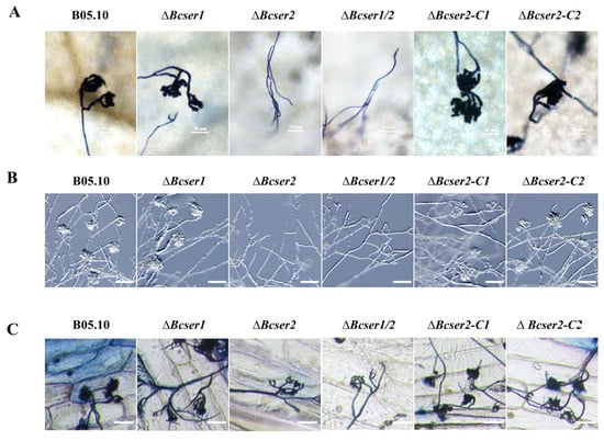 To assess the virulence of the mutants of Bcser1 and Bcser2, infection experiments on different plant leaves were performed. After inoculation, the box containing leaves was placed in a chamber at 20 °C with a 16-h photoperiod. The results showed that ∆Bcser2 and ∆Bcser1/2 failed to penetrate intact leaves of Arabidopsis or tomato, while the ∆Bcser1 mutant, WT strain and the complemented strains ∆Bcser2-C1 and ∆Bcser2-C2 caused serious disease lesions (Figure 4A), suggesting that Bcser2 is essential for the full virulence of B. cinerea. Interestingly, both ∆Bcser2 and ∆Bcser1/2 could successfully infect wounded leaves of Arabidopsis and tomato. Furthermore, the disease lesions induced by ∆Bcser2 and ∆Bcser1/2 mutants on wounded leaves were almost the same as induced by the WT strain (Figure 4B). In addition, virulence assays on Arabidopsis also showed that the lesions induced by the wild-type and complementary strain continued to expand at 4 dpi, and the leaf surface is totally invaded and rotted at 7 dpi, but the ∆Bcser2 and ∆Bcser1/2 mutants still did not produce any lesions at this time point (Figure S6). These results further indicate that Bcser2 is crucial to the virulence of B. cinerea.