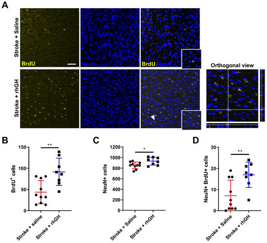 2.4. GH Treatment Promotes Cell Proliferation and Neurogenesis within the Peri-Infarct Region
