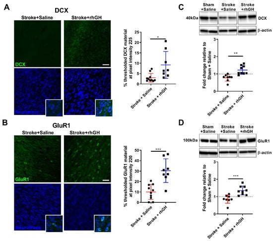 2.5. GH Treatment Promotes Expression of GluR1 within the Peri-Infarct Region