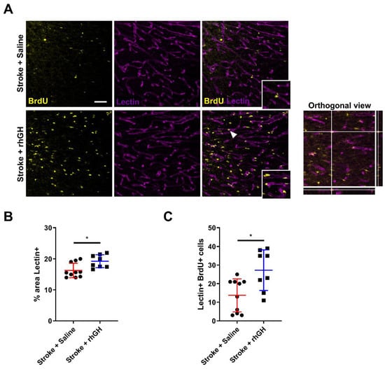 2.6. GH Treatment Promotes Angiogenesis within the Peri-Infarct Region