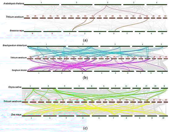 Synteny relationships of Hsfs in wheat and six representative species. (a) Synteny relationships of Hsfs between wheat with Arabidopsis (Arabidopsis thaliana) and Chinese cabbage (Brassica rapa). (b) Synteny relationships of Hsfs between wheat with rice (Oryza sativa) and maize (Zea mays). (c) Synteny relationships of Hsfs between wheat with sorghum (Sorghum bicolor) and Brachypodium (Brachypodium distachyon). Gray lines in the background indicate the synteny blocks for wheat and other plant genomes, and the lines in other colors highlight the synteny of Hsf pairs.