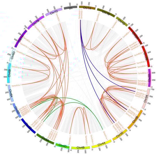 Genomic locations of Hsfs and segmental duplicated gene pairs in the wheat genome. Gray lines in the background indicate the synteny blocks within the whole wheat genome, and red lines denote the segmental duplication HSF gene pairs. The blue lines show genes that have undergone segmental duplication with TaA4d-1, while the green lines show the genes that have undergone segmental duplication with TaA1a-1.