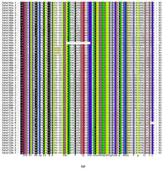 In plants, HSFs are involved in various molecular processes and they have essential roles in the responses to abiotic stresses. Previous studies identified 21, 25, 25, 25, 25, and 22 Hsf genes in Arabidopsis, rice, maize, sorghum, tomato, and chickpea, respectively [,,,,]. The number of HSF family members appears to be unrelated to the genome size, e.g., 35 Hsfs were found in Chinese cabbage (485 Mb) and 137 Hsfs in pear (527 Mb) [,]. Previous studies identified 56 and 82 members of the wheat HSF family [,], but we identified 61 TaHsfs in this study. To understand these differences in the numbers of wheat HSF members identified, we blasted the protein sequences identified by Xue et al. [] and Duan et al. [] against the latest wheat reference genome (IWGSC V1.1) []. Using the latest version gene IDs as standards, 77 genes were identified in all three studies, where four unique genes were identified in the present study, whereas six unique genes were identified by Duan et al. [] and one by Xue et al. [] (Figure S3, Table S11). The 16 protein sequences not identified as HSFs in the present study were analyzed. Although the DBD domains were detected, no high threshold coiled-coil structure was found by using MARCOIL software (https://bcf.isb-sib.ch/webmarcoil/webmarcoilC1.html) []. These findings matched with the identification criteria employed in the present study, so they were excluded. In total, 41 common HSFs were identified in all three studies, but the classifications and names of some of these proteins differed in the studies by Xue et al. [] and Duan et al. []. For example, TraesCS1A02G375600, TraesCS1D02G382900, and TraesCS1B02G396000 were renamed as TaHsfA6a-1, TaHsfA6a-2, and TaHsfA6a-3 in the present study because they belong to a homeologous group and are orthologous to rice Os10g28340 (A6a). However, Duan et al. [] classified these genes in classes A4 and C1, and TraesCS1B02G396000 was not even identified in the study of Xue et al. []. The main reasons for the differences in the three studies are as follows. First, the wheat genome sequence was not completed when these previous studies were conducted, and thus the assembly of incomplete and incorrect genes resulted in the failure to find all of the HSF gene family members. Second, the different threshold settings and strategies employed as identification criteria resulted in differences in the number of wheat HSF family members identified.