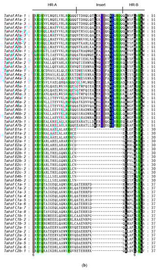 Analysis of the conserved DNA-binding domain (DBD) domains and oligomeric domain (OD) regions in the 61 TaHsfs. (a) Multiple sequence alignment of the DBD domains in 61 TaHsfs. (b) Multiple sequence alignment of the heptad repeat A/B (HR-A/B) regions in 61 TaHsfs. The scheme at the top shows the locations and boundaries of the HR-A core, insert, and HR-B regions within the HR-A/B regions.
