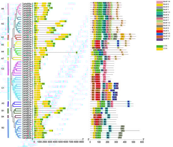 Phylogenetic tree, gene structure, and architecture of conserved protein motifs in TaHsfs. Details of the clusters in the phylogenetic tree are shown in different colors. The left panel represents the intron–exon structure of the TaHsfs, and the right panel shows the motif compositions of the TaHsfs. Different motifs are indicated by different colors and they are numbered from 1–15.