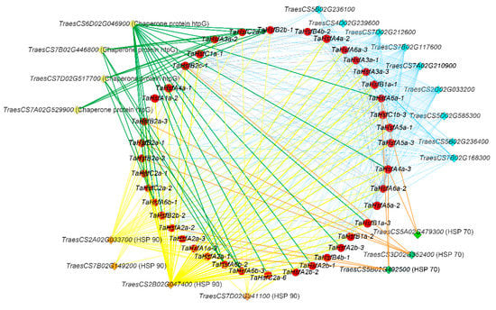 Interaction network between TaHsfs and related genes. The red circles represent TaHsfs and the diamonds in other colors represent the genes that interact with them. Lines connecting two genes show that an interaction exists between them.