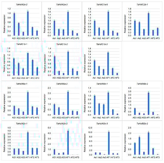 Based on the RNA-seq data, we identified seven up-regulated genes in the spikes of Chinese Spring and eight up-regulated genes in the fertile anthers of KTM3315A. In order to identify differentially expressed TaHsfs in fertile and sterile anthers, we performed quantitative real-time PCR (qRT-PCR) for the 15 candidate TaHSfs in three stages of anther development. The results showed that the expression levels of all 15 TaHsfs were highest in the uninucleate stage and they gradually decreased in the following two stages (binucleate stage and trinucleate stage) (Figure 8). There was no quantitative difference in the expression levels of the seven up-regulated TaHsfs in the Chinese Spring spikes during the three stages for AS and AF. However, the qRT-PCR results for the other eight TaHsfs were consistent with the RNA-seq results, where they were up-regulated in the uninucleate stage for AF compared with AS, and three TaHsfA2bs (-1, -2, -3) were significantly up-regulated. The regulation of HsfA2 genes is known to be involved with redox homeostasis and metabolic, which are critical pathways for normal anther development []. In addition, the expression levels of HsfA2s are high in the early stages of anther and pollen development, and their important roles in the regulation of pollen protection genes have been confirmed in tomatoes [,,]. Therefore, the three TaHsfsA2bs with high level expression levels in the fertile anthers may be candidate genes involved in anther protection during fertility conversion in the thermo-sensitive male sterile wheat line KTM3315A.
