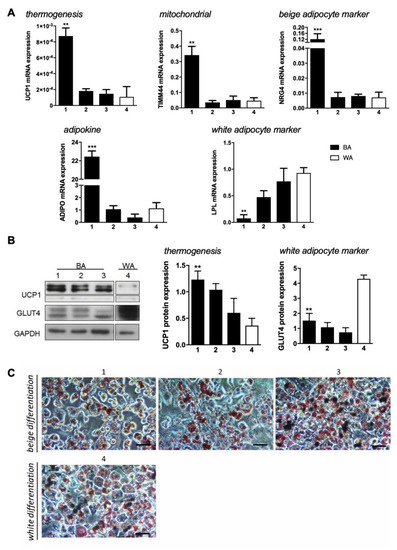 Beige and white adipocyte markers expression and their modulation by four differentiation-inducing cocktails in 3T3-L1 cells. (A) Relative expression of UCP1, TIMM44, NRG4, ADIPO, and LPL in 3T3-L1 fibroblasts that were induced to differentiate into beige (1–3; black bars) (BA) and white (4; white bars) (WA) adipocytes. Gene expression values are relative to ARP. (B) Representative blots and relative UCP1 and GLUT4 protein expression in 3T3-L1 fibroblasts that were induced to differentiate into beige (1–3; black bars) and white (4; white bars) adipocytes in relation to Glyceraldehyde 3-phosphate dehydrogenase (GAPDH). (C) Lipid droplets characterization by triacyclglycerols staining with Oil Red O expression in 3T3-L1 fibroblasts that were induced to differentiate into beige and white adipocytes. Scale bar = 20 µm. Data represent mean ± SEM of three independent experiments. * p < 0.05, ** p < 0.01, *** p < 0.001.