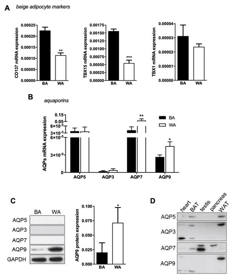 AQP7 and AQP9 differential expression in beige and white adipocytes. (A) Relative expression of several beige adipocyte markers (CD137, TBX15, and TBX1) and (B) aquaporins (AQP5, AQP3, AQP7, and AQP9) in 3T3-L1 fibroblasts induced to differentiate into beige (BA; black bars) and white (WA; white bars) adipocytes. Gene expression values are relative to ARP and to Eef2. (C) Representative blots and relative AQP9 protein expression in 3T3-L1 fibroblasts that were induced to differentiate into beige (BA; black bars) and white (WA; white bars) adipocytes in relation to GAPDH. A single band of 33 kDa was detected in cultured cells. (D) Antibodies validation against AQP5, AQP3, AQP7, and AQP9 in murine tissues: Heart, BAT, testis, pancreas, and WAT. Data represent mean ± SEM of three independent experiments. * p < 0.05, ** p < 0.01; *** p < 0.001, beige vs. white adipocytes.