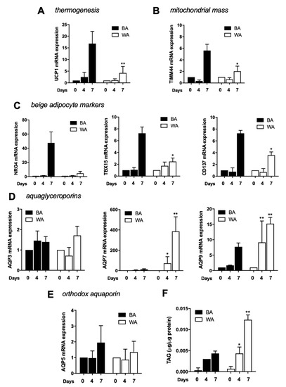 Beige phenotype achievement along differentiation. (A) Relative expression of UCP1, (B) TIMM44, (C) NRG4, TBX15, CD137, (D) AQP3, AQP7, and AQP9 and (E) AQP5, in 3T3-L1 fibroblasts induced to differentiate into beige (BA; black bars) and white (WA; white bars) adipocytes at day 0, 4, and 7 of differentiation. Gene expression values are relative to ARP and Eef2 and to day 0. (F) Triacylglycerols accumulation in 3T3-L1 fibroblasts induced to differentiate into beige (BA; black bars) and white (WA; white bars) adipocytes at day 0, 4, and 7 of differentiation. Data represent mean ± SEM of three independent experiments. * p < 0.05, ** p < 0.01, differentiation time point vs. previous time point.