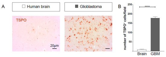 To investigate the specificity of TSPO for tumor tissue, we first analyzed patient GBM samples and compared them to those from a normal human brain. We found that in tumor-free brain tissue from epilepsy patients, few cells expressed TSPO (Figure 1A). However, the number of TSPO-positive cells largely increased in GBM tumor tissue (as seen in Figure 1A and quantified in Figure 1B).