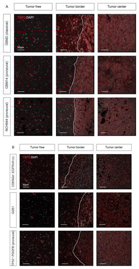 The implantation of these human GSCs produced patient-derived xenografts (PDX) with a high expression of TSPO in the tumor area (Figure 2A) for the classical human GBM (GBM2), as well as for the proneural human GBM (GBM14 and NCH644). In the tumor, border dispersed cells strongly positive for TSPO were visible (Figure 2A, arrows in the tumor border), likely showing invading cells and macrophages, while in the tumor-free regions, these expression patterns were weaker (Figure 2A, arrows in tumor-free areas). Next, we used a panel of genetically engineered mouse GBM cells that faithfully recapitulate the key pathological features for each GBM subtype (Table A1) [24]. By immunofluorescent staining against TSPO, the distinction between tumor-free brain and tumor samples became obvious when using murine Gl261, as well as the classical cdkn2aKOEGFRvIII or proneural 53KOPDGFB GSCs (Figure 2B). In addition, in the murine GBM models, evenly dispersed TSPO-positive cells could be observed in tumor border and tumor-free areas (Figure 2B, arrows).
