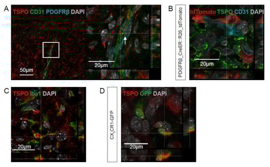 TSPO is expressed in tumor endothelia, pericytes, and myeloid cells. (A) Gl261 tumors grown for 3 weeks were co-stained by immunofluorescence for-anti-TSPO- (red), anti-CD31- (green), and anti-PDGFRB-antibodies (cyan) showing TSPO expression (red) in endothelia (green) and pericytes (cyan). (B) From Gl261 implants of PDGFRB::CreERT2,R26-tdTomato (red), mice immunofluorescent co-staining was performed using anti-CD31 (cyan) and TSPO (green), demonstrating the co-expression of TSPO in tdTomato-expressing pericytes (red). (C) Fluorescence staining with anti-Iba1 (green) and anti-TSPO (red) antibodies shows co-expression in tumor-associated myeloid cells. (D) TSPO immunofluorescence in the GL261 implant in CX3CR1-GFP mice confirms the co-expression of TSPO (red) in GFP (green)-positive microglia. (A–D) DAPI nuclear counterstaining is shown in gray; scale-size is indicated in the individual micrographs.
