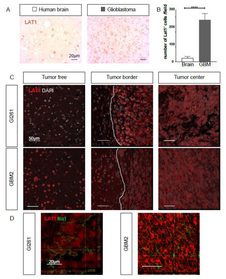 Amino acid transporter light chain L system (LAT1) expression is increased in human and murine GBM. (A) Immunohistochemistry of epilepsy (n = 4) and GBM patient samples (n = 4) was performed. LAT1 expression is more prominent in cells in the GBM sample compared to the control brain. (B) Number of LAT1-positive cells per field of view under a 20× objective was counted in all immunostained samples. In human GBM, significantly more cells were LAT1-positive compared to the tumor-free brain. Statistical significance (t-test) is indicated. **** p < 0.0001. (C) Immunofluorescent staining was performed against LAT1 in orthotop murine GBM (Gl261) or patient-derived xenografts (GBM2). LAT1 (red) expression was strong in the tumor boarder, while a weaker expression was visible outside the tumor area. (D) Immunofluorescent co-staining of orthotop murine glioblastoma (Gl261) or human xenograft (GBM2) for LAT1 (red) and Iba1 (green) shows no co-expression of LAT1 in myeloid cells. Scale size is indicated in individual micrographs.