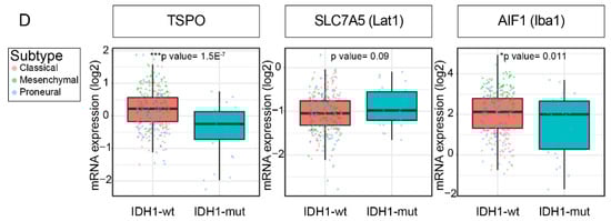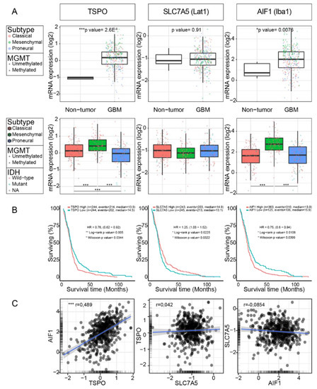 TSPO, solute carrier family 7 member 5 (SLC7A5), and AIF1 expression analysis in a TCGA GBM cohort. Patient GBM samples of the TCGA database were analyzed using GlioVis [29]. (A) Gen expression levels in GBM compared to the tumor-free brain showed that expression levels for TSPO and AIF1 were significantly higher in GBM. P-value of Student’s t test is indicated (upper panel). Significant differences between the gene expression of TSPO and AIF1 were also detected for GBM subtypes. Statistical significance (Tukey’s Honest Significant Difference) is indicated, *** p < 0.0005 (lower panel). (B) Survival of patients with a high or low expression of TSPO, SLC7A5, or AIF1 was analyzed. High TSPO or AIF1 expression was associated with significantly shorter survival, while high SLC7A5 expression levels were favorable for survival. Patient number indicated in graph. (C) A correlation between the genes TSPO, SLC7A5, and AIF1 was performed. A significant positive correlation between TSPO and AIF1 (Pearson’s r = 0.489) was observed, while no correlation between the other pairs could be seen. (D) Expression levels for TSPO and AIF1 were significantly higher in IDHWT GBM than in IDHMUT. P-value of Student’s t-test is indicated.
