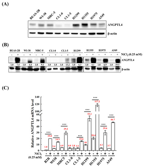 We screened the expression of ANGPTL4 in various normal cell lines BEAS-2B, MRC-5, and WI-38 and tumour lung cell lines A549, H1355, H1299, H1975 CL1-0, and CL1-5 to investigate the roles of ANGPTL4 in lung cancer progression. We observed that most of the cell lines, except CL1-0 and CL1-5, had increased expression of full-length ANGPTL4 (Figure 1A). Additionally, to evaluate the effect of NiCl2 on normal and tumour cells, the expression of ANGPTL4 mRNA, and protein was investigated in various normal and tumour lung cell lines that were cultured under the treatment of NiCl2 (Figure 1B,C). The expression of ANGPTL4 was significantly upregulated in almost all cell lines under NiCl2 exposure.