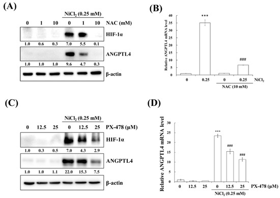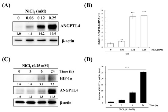 BEAS-2B cells were treated with varying concentrations of NiCl2 and for various periods of time to confirm the effects of nickel treatment on ANGPTL4 expression. As evident in Figure 2A,B, NiCl2 exposure resulted in the substantial upregulation of ANGPTL4 protein and gene expression, as assessed while using Western blot and real-time, respectively, in a dose- and time-dependent manner. NiCl2 also stimulated HIF-1α expression; we found that HIF-1α showed up after 6 h of NiCl2 exposure. Consistently, ANGPTL4 was also expressed after 6 h of exposure and showed obvious expression after 24 h of exposure (Figure 2C,D).