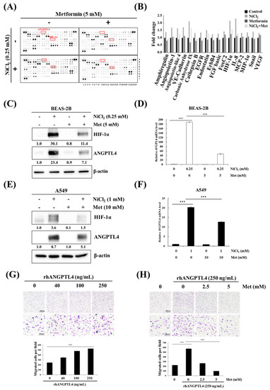 Metformin represses NiCl2-induced ANGPTL4 activation and hypoxia-inducible factor-1α (HIF-1α) expression. (A) Protein profiles were performed in NiCl2- and metformin-treated BEAS-2B cells for 48 h using a Proteome Profiler Human XL Oncology Array kit. (B) Seventeen gene expression values were generated by calculating the mean spot pixel density from the array that was affecting by NiCl2 and metformin. Data are presented as a fold change in each protein compared with the untreated group. (C,D) BEAS-2B and (E,F) A549 cells combined with 0.25 mM or 1 mM NiCl2 and 5 mM or 10 mM metformin for 24 h, western blotting and qPCR were used to determine protein and mRNA expression. (G) Migration of A549 cells across transwell filters for 24 h. A quantity of 10% FBS DMEM medium was placed in the bottom chamber containing various doses of ANGPTL4 recombinant protein. Bar graph: Quantitation of migrated cells/field. The results were obtained from three random fields per filter and represented the means ± SD. *** p < 0.001 (H) Cells were pretreated with 0, 2.5, and 5 mM metformin for 24 h and then seeded into transwell chambers without metformin; the bottom chamber contained 25 ng/mL ANGPTL4 recombinant protein.