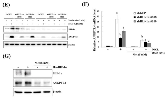 HIF-1α is involved in NiCl2-induced ANGPTL4 expression. (A) N-acetyl-L-cysteine (NAC), the ROS scavenger, inhibited NiCl2-upregulated ANGPTL4 expression. Determination of HIF-1α and ANGPTL4 protein levels in BEAS-2B cells pretreated with NAC for 1 h and cultured under NiCl2 for 24 h. (B) qPCR was performed to detect ANGPTL4 mRNA levels. Data are shown relative to untreated cells after normalisation to β-actin and reported as the mean ± SD of triplicate experiments. *** p < 0.001 compared with untreated cells; ### p < 0.001 compared with NiCl2-treated cells, as determined by two-tailed t tests. (C) Cells were pretreated with PTX-478, the HIF-1α transcriptional inhibitor, for 1 h and then exposed to NiCl2 for 24 h. Western blotting and (D) qPCR were performed to determine the protein and mRNA expression. (E) BEAS-2B cells were treated with NiCl2 and metformin for 48 h after infecting with lentivirus carrying shGFP (vector control) or shHIF-1α (clone no. #808 and #810). The protein levels of HIF-1α, ANGPTL4, and β-actin were determined while using Western blot analysis. β-actin was used as the internal control. (F) Quantitative analysis of ANGPTL4 mRNA was performed using qPCR. The data are presented as the mean ± SD of triplicate experiments; a = p < 0.001 compared with shGFP untreated cells; b = p < 0.001 as compared with shGFP Ni-treated cells; c = p < 0.05 compared with shGFP Ni- and metformin cotreated cells. (G) HIF-1α overexpression promoted ANGPTL4, which was then inhibited by metformin. Western blot analysis of BEAS-2B cells overexpressing pcDNA3 or HA-HIF-1α-pcDNA3.