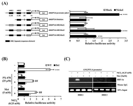 It has been reported that there are several hypoxia response elements (HREs) in the ANGPTL4 promoter [20,22]. We conducted an ANGPTL4 luciferase activity assay to determine which HRE was the binding site of HIF-1α under NiCl2 exposure. The ANGPTL4 luciferase constructs that mutated or deleted the HRE site were all provided by Dr. Inoue and Dr. Wada. Luciferase constructs were transiently transfected into BEAS-2B cells, which were subsequently exposed to NiCl2 for 24 h. Among the five constructs, luciferase activity of the HRE deletion and mutation 1 constructs were not significantly amplified under NiCl2 exposure (Figure 5A). However, the mutation 2 plasmid was increased, as demonstrated by the significant luminescence intensity, and the mutation 3 plasmid was slightly enhanced. These results demonstrate that the HRE1 region, which is located 2 kb upstream of the transcription start site, is the strongest HIF-1α binding site, because mutations within this site completely disrupted the induction of the ANGPTL4 promoter in the presence of NiCl2. We then exposed the HRE1 deletion and WT constructs to NiCl2 and PX-478 or NiCl2 and metformin for 24 h. Figure 5B illustrates that metformin and PX-478 both inhibited NiCl2-induced luciferase activity, but did not affect the activity of constructs that lacked the HRE1 region. After confirming the function of the HRE using the luciferase assay, we conducted a chromatin immunoprecipitation assay to evaluate whether HIF-1α directly binds to HREs and to determine the inhibitory effects of metformin. As shown in Figure 5C, the DNA products were amplified near the HRE1 (−2116 bp to −1931 bp) and HRE3 (−327 bp to −17 bp) regions of the ANGPTL4 promoter. The assay showed that anti-HIF-1α antibody could precipitate HRE1 and HRE3 under NiCl2 exposure. The binding ability of HIF-1α at the HRE1 region was stronger than at the HRE3 region, and metformin suppressed the binding of both HREs, as consistent with the luciferase assay.