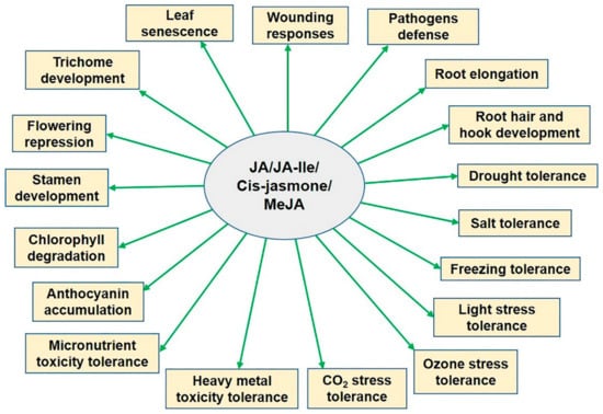 The JAs are ubiquitous in higher plant species, where their levels are high in the reproductive tissues and flowers, but very low in the mature leaves and roots [9,10]. JAs modulate many crucial processes in plant growth and development, such as vegetative growth, cell cycle regulation, anthocyanin biosynthesis, stamen and trichome development, fruit ripening, senescence, rubisco biosynthesis inhibition, stomatal opening, nitrogen and phosphorus uptake, and glucose transport [10,11,12,13,14,15,16,17,18,19,20,21,22,23,24,25]. As signaling molecules, JAs regulate the expression of numerous genes in response to abiotic stresses (e.g., salt, drought, heavy metals, micronutrient toxicity, low temperature, etc.) and promote specific protective mechanisms (Figure 1) [26]. In this review, we focus on the biosynthesis and signaling of JA, cis-jasmone, MeJA, and JA-Ile in response to abiotic stresses because of the high bioactivity of these compounds.