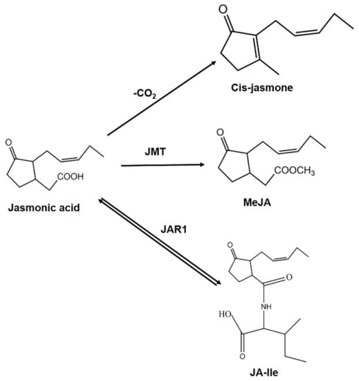 In the cytosol, JA metabolic pathways convert the phytohormone into more than 30 distinct active and inactive derivatives, depending on the chemical modification of the carboxylic acid group, the pentenyl side chain, or the pentanone ring (Figure 2) [36,37,38,39,40]. Among the series of metabolites, free JA, cis-jasmone, MeJA, and JA-Ile are considered to be the major forms of bioactive JA in plants [10,41]. cis-jasmone is produced through the decar-boxylation of JA (Figure 3) [42]. The volatile MeJA is produced from JA through the activity of JA carboxyl methyltransferase (Figure 3) [26]. Jasmonate amino acid synthetase 1 (JAR1) catalyzes the reversible conversion between JA and JA-Ile (Figure 3) [41]. Evidence suggests that JA-Ile is an important compound in the JA signal transduction pathway [43].